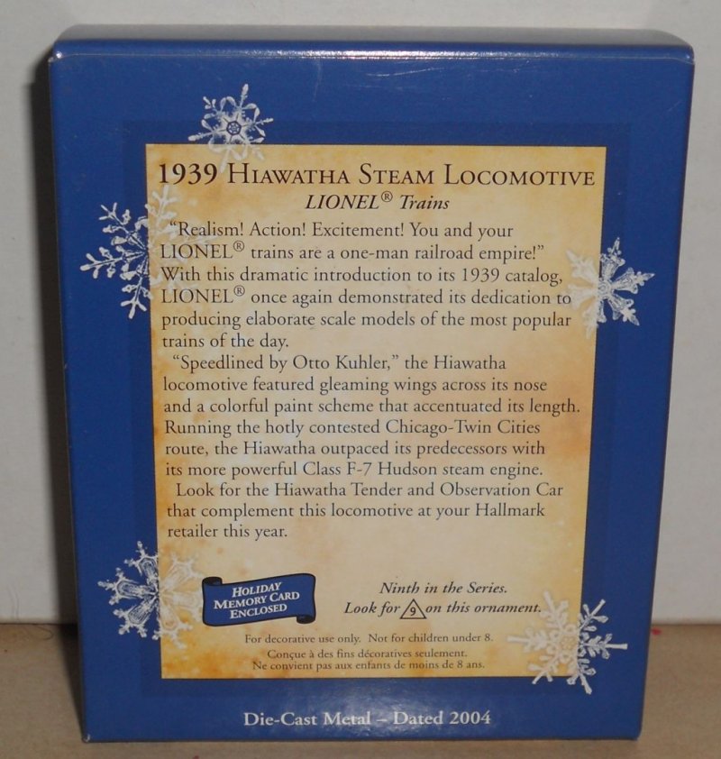 more great disney collectibles @ www.everythingcollectibles.biz Rare and Hard to Find 2004 Hallmark Keepsake Ornament 1939 HIAWATHA STEAM LOCOMOTIVE MIB 9th in series Lionel Train. In very good condition. please see photo for more details. dont hesitate to ask any questions. International buyers please contact us for a s