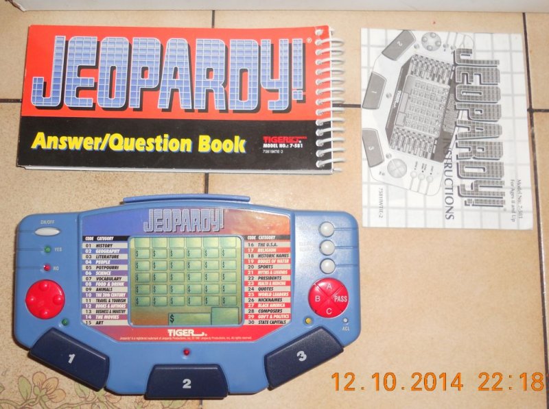 more great collectibles @ www.everythingcollectibles.biz. For sale is a rare and hard to find 1997 Tiger Electronics JEOPARDY with ANSWER & QUESTION book and CARTRIDGE Handheld Game. in good used condition. please see photo for more details. what you see is what you will recieve. if you have any additional questions please dont hesitate to ask.