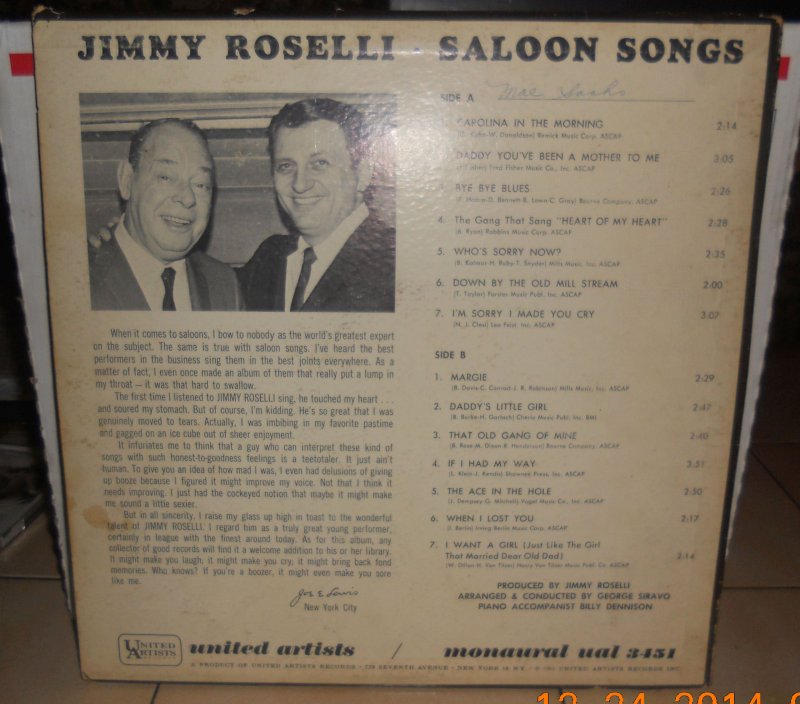 Jimmy Roselli Saloon Songs UAL 3451 LP Record United Artists. Both the Record and Jacket are in VG+ condition. please see photo for more details. what you see is what you will receive. Track List :