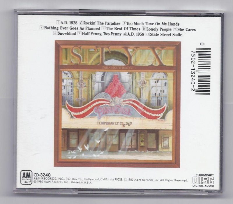 More Great CD's @ www.everything-collectibles.com For Sale is an Styx Paradise Music CD. in good used condition. adult owned from private collection. please see photo for more details. what you see is what you will receive. please don't hesitate to ask. Free shipping within the US. Please note all CD's Ship via Media Mail.