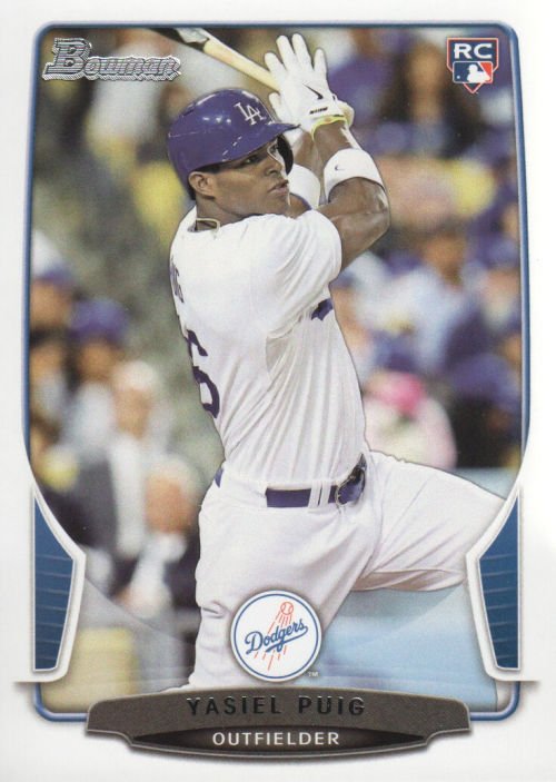 more Great cards @ www.everythingcollectibles.biz For Sale is a 2013 Bowman Draft #1 Yasiel Puig Card in NrMt Condition. all single cards are shipped in Penny Sleeves and top loaders. all orders ship with delivery confirmation as well. we usually ship within 2 days of receiving an order. Shipping is a Flat $2 no matter how many cards you buy 1 or 1000 its still $2.