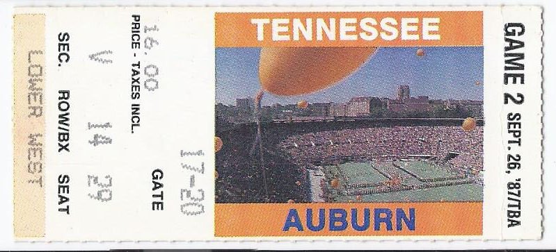 1987 NCAA College Football Ticket Stub Auburn @ Tennessee September 26th 9 26 87