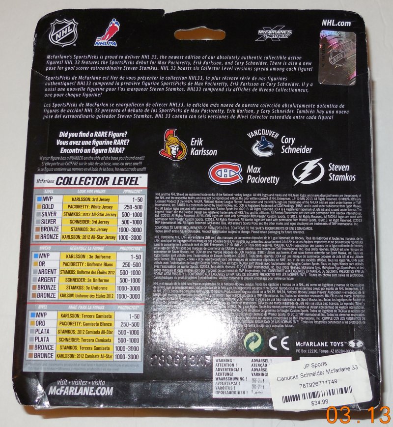 More great collectibles @ www.everythingcollectibles.biz Mcfarlane NHL hockey Series 33 Cory Schneider Variant 3rd Jersey 390/1000 NRFP. This is the Silver Collectors Level Variant. Its in MONMC (Mint on Non Mint Card) what you see is what you will recieve. please see photos for more details. dont hesitate to ask any questions. international buyers please contact us for a shipping quote