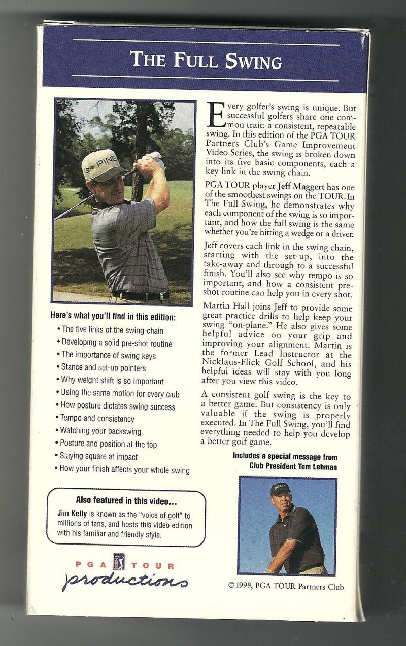 For Sale is a Good Used Condition PGA Tour Partners Club Game Improvement Series The Full Swing with Jeff Maggert VHS Video Tape. What you see is what you will receive. Rare and Hard To Find