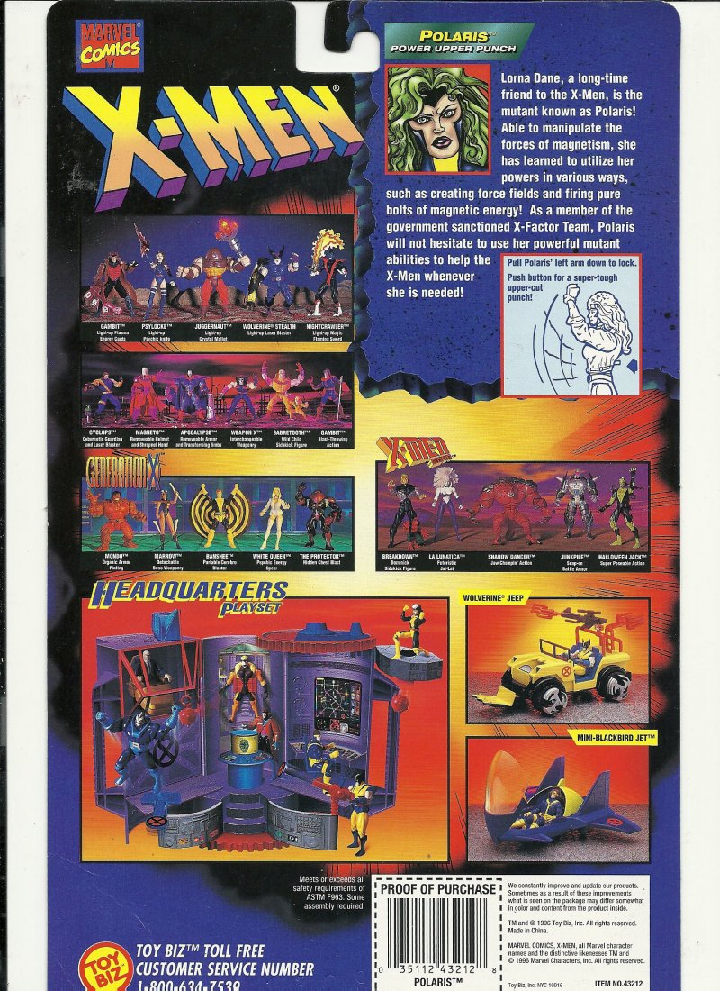 1993 Toy Biz Uncanny X Men Polaris Power Upper Punch CARD BACKING. This is for the CARD Backing ONLY no figure and No Accessories Its in good Used condition no rips or tears. please see photo for more details. What you see is what you will recieve. dont hesitate to ask any questions. all international buyers p