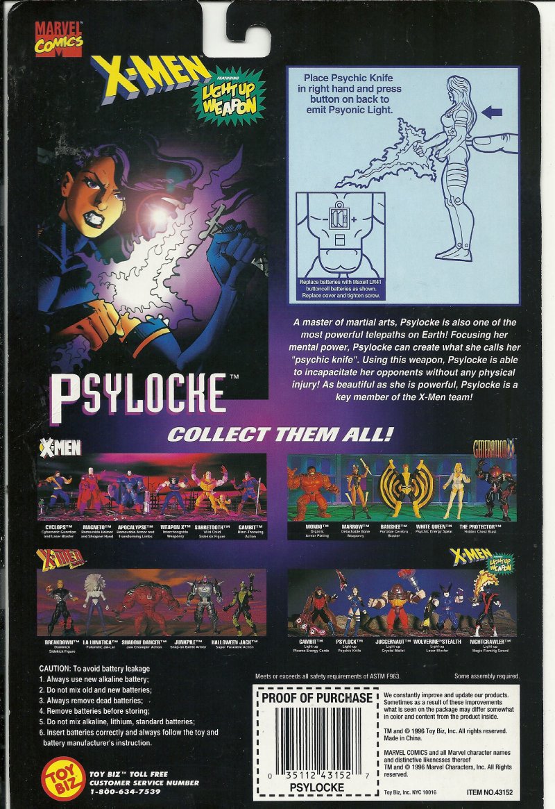 1993 Toy Biz X Men Classics Psyloke Light Up weapon CARD BACKING. This is for the CARD Backing ONLY no figure and No Accessories Its in good Used condition no rips or tears. please see photo for more details. What you see is what you will recieve. dont hesitate to ask any questions. all international buyers p