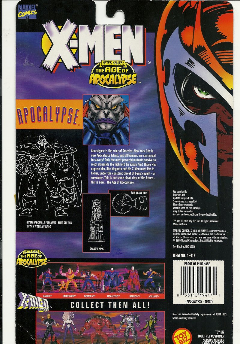 1993 Toy Biz X Men After Xavier The Age Of Apocalypse Apocalypse CARD BACKING. This is for the CARD Backing ONLY no figure and No Accessories Its in good Used condition no rips or tears. please see photo for more details. What you see is what you will recieve. dont hesitate to ask any questions. all international buyers p