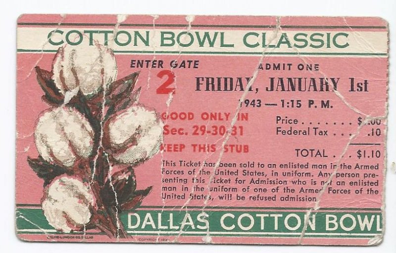 1943 cotton bowl ticket stub Texas Georgia Tech