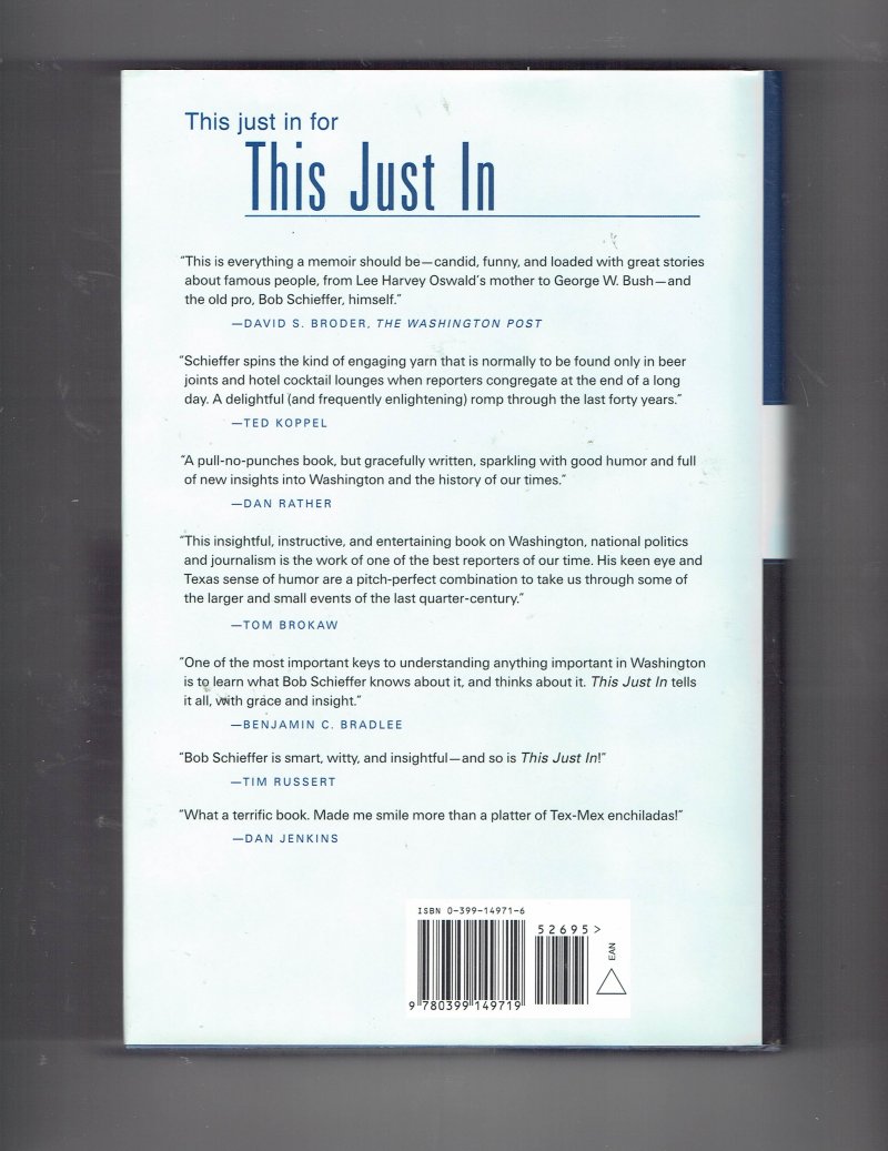 For Sale This Just In What I Couldn't Tell You on TV by Bob Schieffer Signed Autographed. 100% Authentic. Book will be accompanied by our COA.
