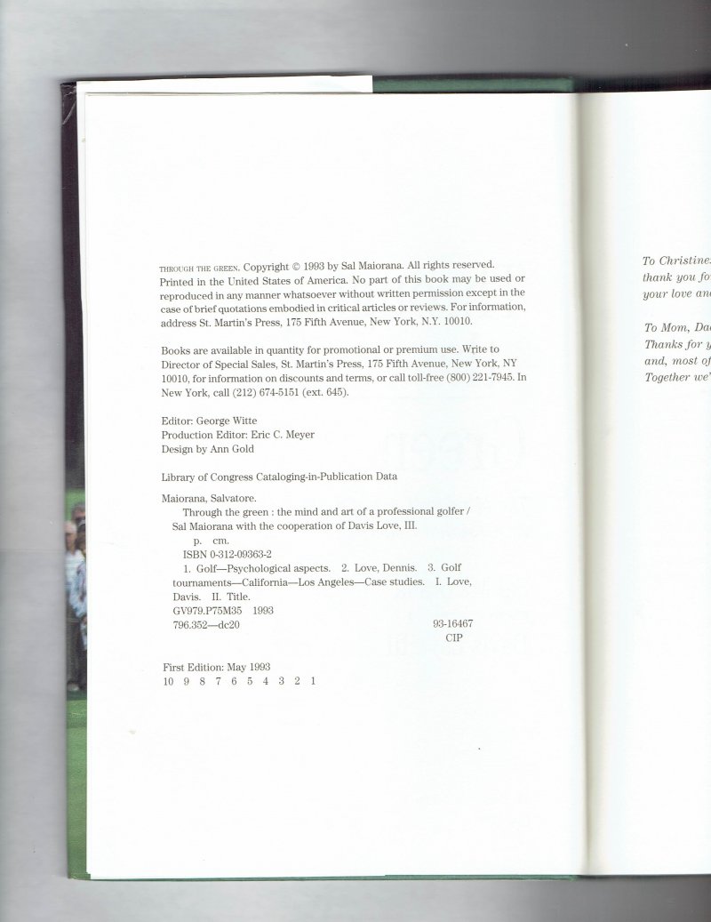 For Sale THe Book Through the Green by Sal Maiorana Signed By Davis Love III PGA Champion. Book in good condition with Shelf and storage wear. Has Dust Jacket. 100% Authentic Signature and comes with COA from Everything Collectibles. Fast Same or Next Day shipping with Delivery Confirmation.