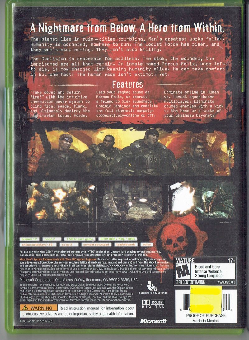 more great Video Games @ www.everything-collectibles.com Gears of War Xbox 360 video Game 2006 CIB (Case, Manual and Disc). This Video Game is in good used condition as you can see from the picture tested and works. if you have any further questions please don't hesitate to ask! if your order is over $50 Shipping is FREEE within The U.S.!!!